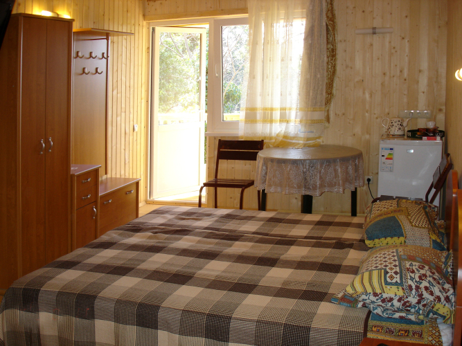База отдыха расположена в тихом районе Фороса. Это деревянное двухэтажное здание, которое находится рядом со сквером и санаторием "Форос". Три однокомнатных номера по 18 кв.м в деревянном доме. Стены, потолок – деревянная вагонка. Пол из дерева. На территории оборудована летняя, полностью оборудованная беседка-кухня.