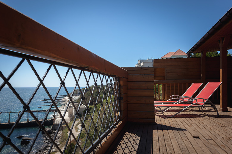 Двухэтажное строение из дерева, 3 номера расположены с общим балконом с видом на море, винтовая лестница, общий двор, мангал. Два отдельных однокомнатных деревянных домика.