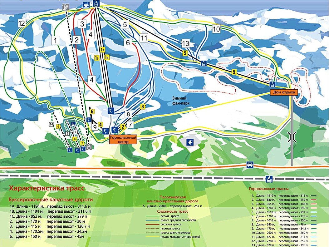 Сам горнолыжный курорт расположен в долине реки Сакмары и возвышается над уровнем моря на высоту 200 метров. Главный склон горы имеет ширину 1000 метров, что позволило разделить его на несколько участков. На первом участке катаются новички, в основном с инструкторами, которые считаются профессионалами своего дела и смогут провести индивидуальные занятия для всех желающих. Они обучат основам катания на горных лыжах или сноубордах. Второй и третий участки отведены для любителей и опытных любителей. Четвертый участок предназначен для катания на сноубордах и скоростному спуску с горы. Ну а пятый считается спортивной трассой. Длина каждой трассы отличается – начиная с 250 метров и заканчивая высотой в 2500 метров. Для подъема на гору можно воспользоваться шестью подъемниками, которые отличаются по скорости и по высоте.