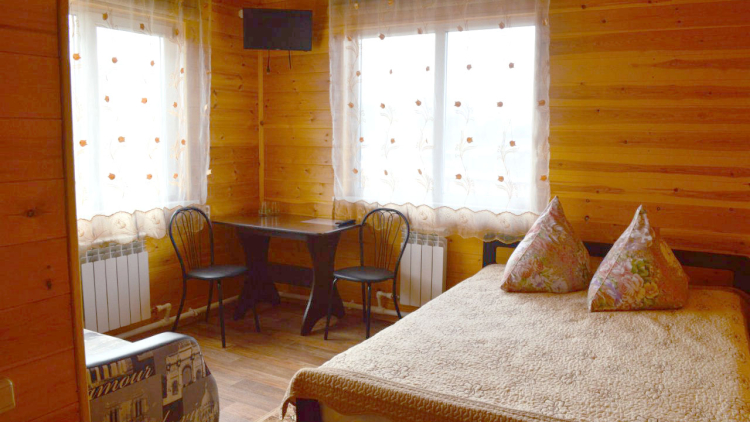 Благоустроенные номера. Душ, туалет в номере. Телевизор, холодильник, 2-х спальная кровать, раздвижной диванчик, стол , стулья, прихожая, -. В зимнее время кухня на этаже с необходимым инвентарем.