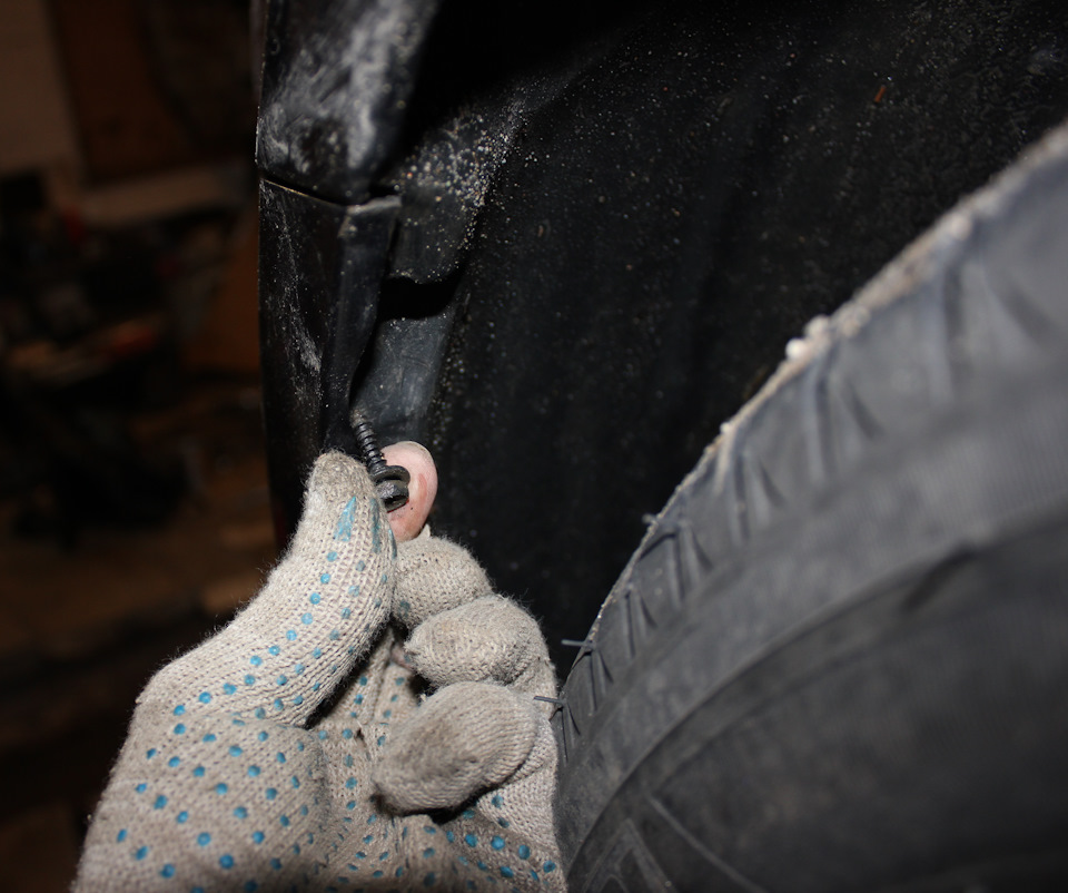 Далее между задним крылом и обшивкой помещается торцовый ключ с 5-6-сантиметровым удлинителем. Он надевается на болты, которые аккуратно выворачиваем.