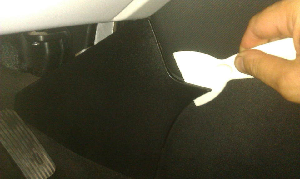 Вставляем лезвие под консоль до упора, сначала справа внизу, на пару см выше нижнего края и тянем на себя.