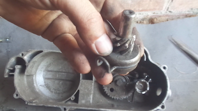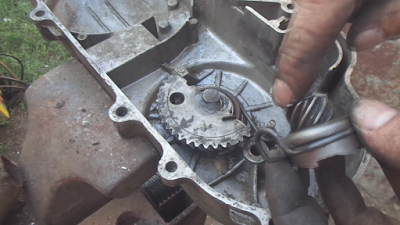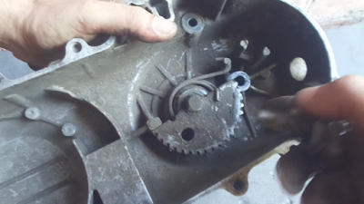 Чтобы вставить храповик на место, надо немного провернуть сектор против часовой стрелки так что бы заваренные зубья (нужны для фиксирования рычага кикстартера) сектора зашли за отверстие оси храповика, мне удобно делать это левой рукой, при установке храповика следите что бы его скоба попала между выступами на крышке вариатора.