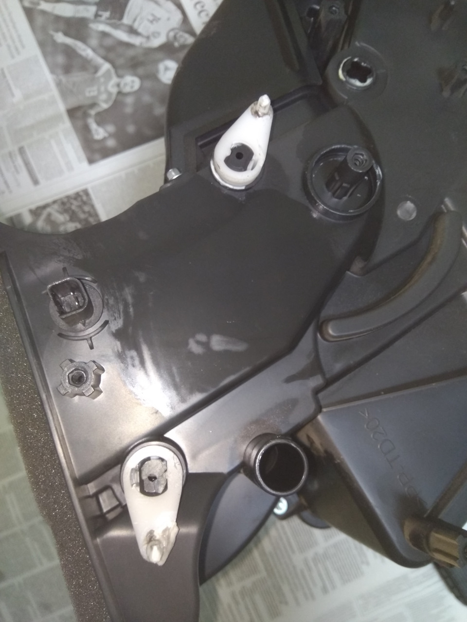 Так мы получим доступ к тяге. Остается только отремонтировать ее по вышеописанному методу (вырезать металлические крюки) и установить все обратно.