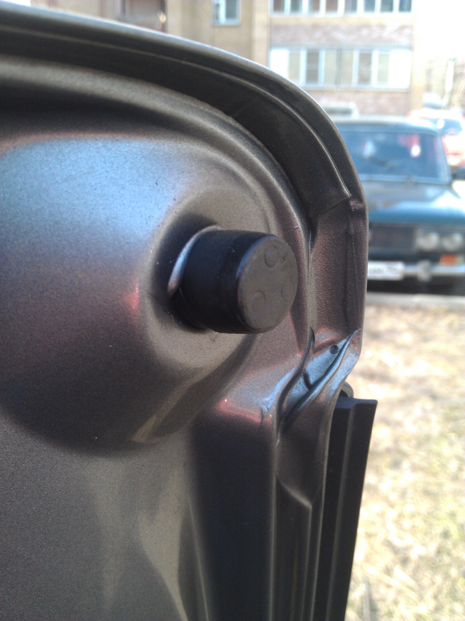 Тут есть несколько ходов. Сначала проверяем петли на предмет провисания. Если дверь сильно шатает, то это "не есть гут". У меня петли пока живы. Затем проверяем уплотнитель двери на предмет смятия и разрывов (говорят, что помогает замена на более толстоупругий уплотнитель от ТАЗ-2109, но у меня Куб отторгает все "инородные" отечественные запчасти). И, наконец, можно поиграться с регулировками отбойника двери, который такой круглорезиновый торчит сверху пипкой. Например, выкрутить его, тем самым увеличив зазор между дверью и кузовом — фихта! Мне не помогло… =(