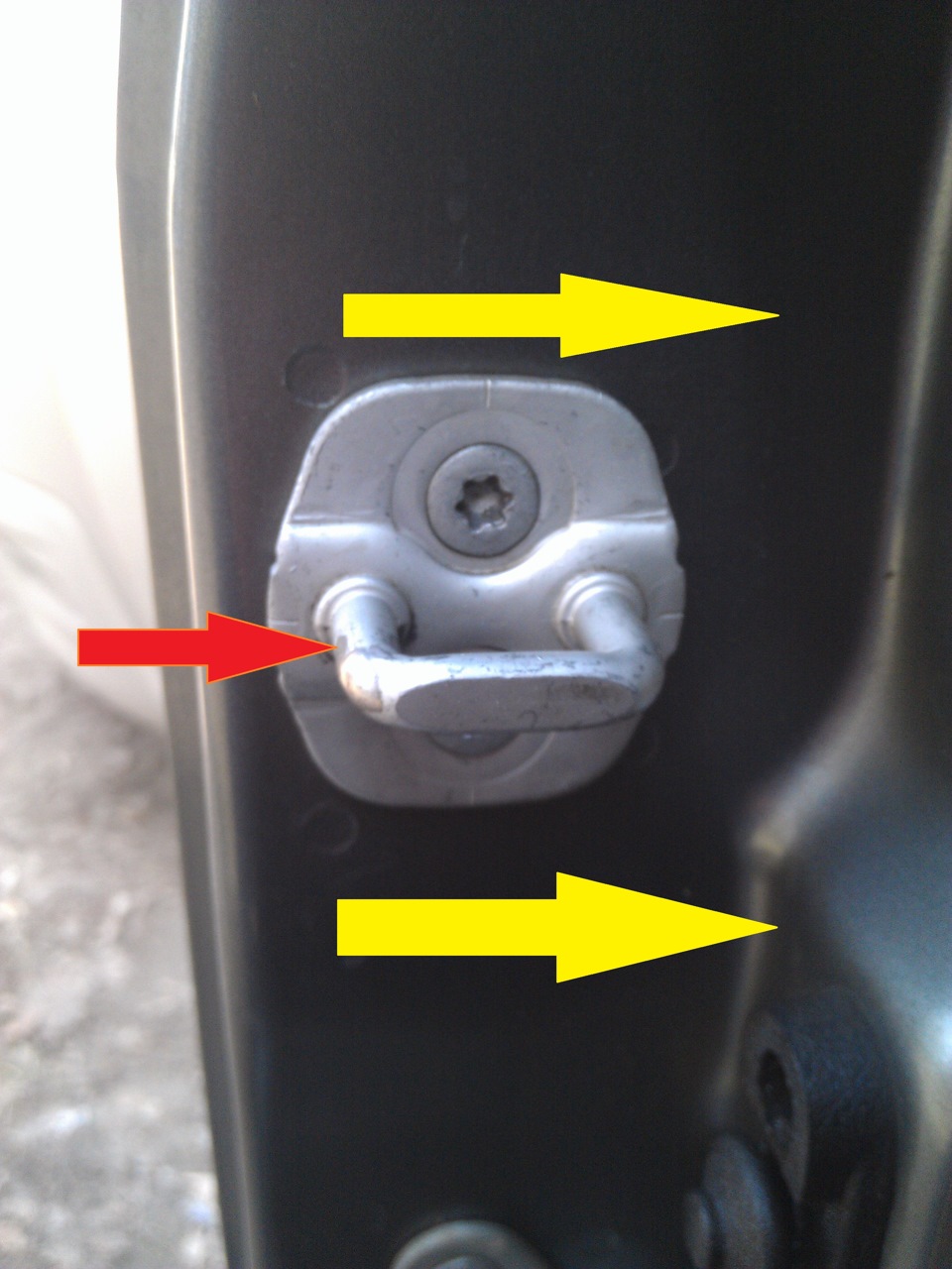 Винты крепления скобы замка отпускаем примерно на четверть оборота звёздочкой на 40 и слегка вдариваем молоточком по скобе в направлении внутренностей салона. Удар по скобе — красная стрелка, перемещение скобы — жёлтые стрелки. Я сдвинул примерно на 1,5 — 2 мм. вглубь.