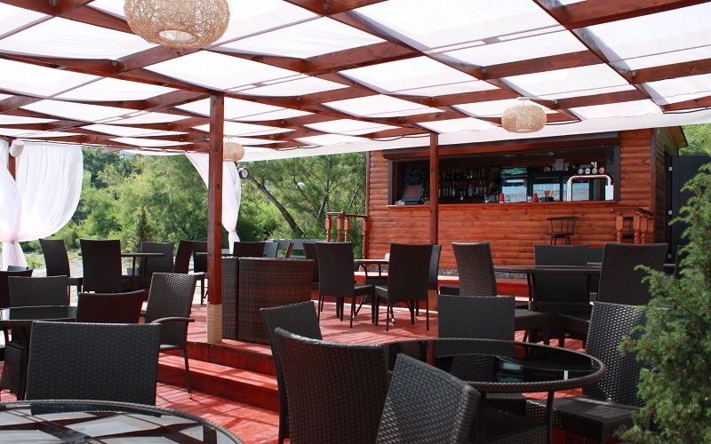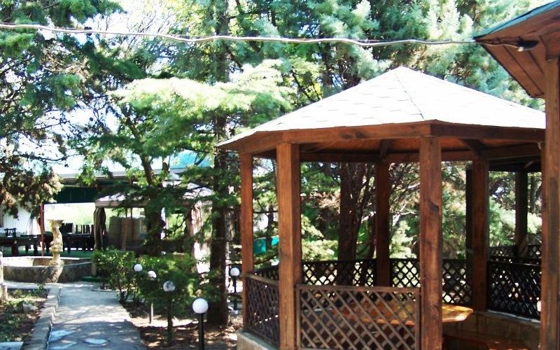 Под навесом мы любили завтракать, когда солнце не сильно пекло и ветерок с моря лишь слегка приятно обдувал. Обедали и ужинали в беседках, в окружении деревьев хвойных пород. В погожий вечер хорошо посидеть под навесами у моря до закрытия с кофе и коньяком, под ненавязчивую приглушенную музыку.