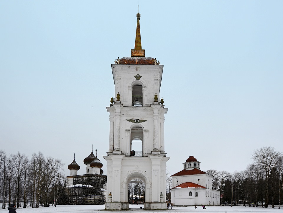 В 1765 году в Каргополе случился большой пожар, после этого город был перестроен по регулярному плану. Екатерина Великая дала городу деньги на восстановление. В честь императрицы на Соборной площади была построена красивая колокольня в стиле русского классицизма. Колокольню поставили так, чтобы она была видна с Петербургского тракта, откуда в город должна была приехать Екатерина. Императрица в Каргополь так и не приехала, зато жители и гости города могут любоваться красивой колокольней, которая выходит на Ленинградскую улицу, и даже подняться на нее. Стоит это удовольствие 70 рублей.