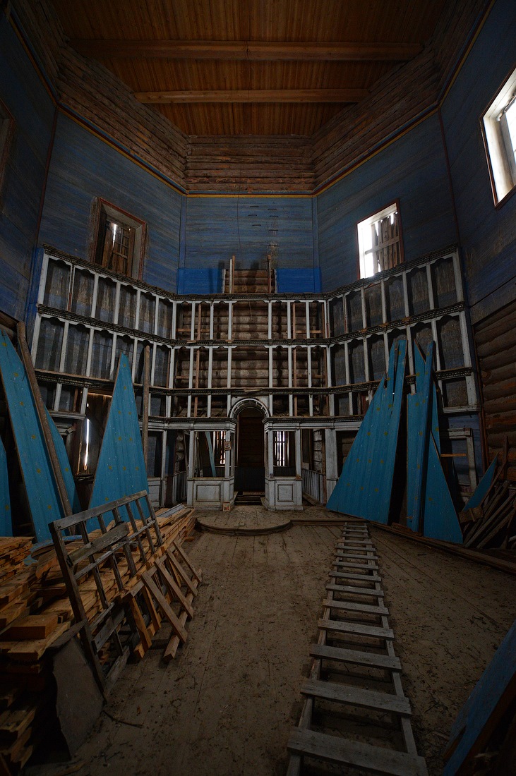 11. Церковь частично в лесах, хотя реставрация до конца не доведена. Наверх можно забраться, но будьте аккуратны, время не очень гуманно относится к дереву. Внутри остатки иконостаса и расписного неба. А еще пыль и паутина: