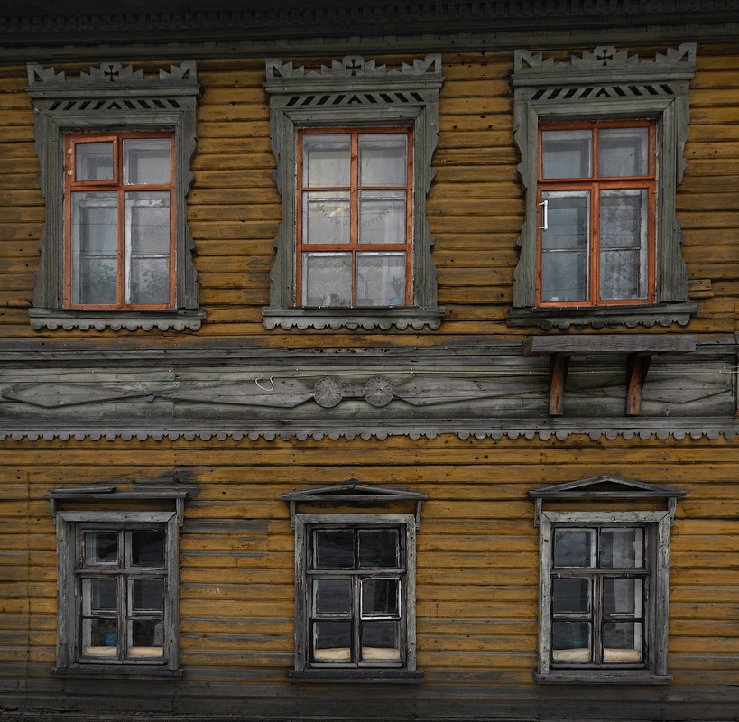 У двух этажных построек верхние окна с каким-нибудь красивым наличником, нижние попроще.