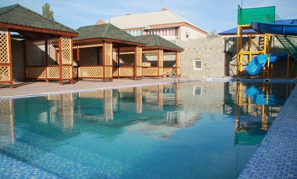 Аква-зона: Открытый бассейн с пресной подогреваемой водой (120 кв.м); 2 уровня глубины; аква горка. Работает сезонно