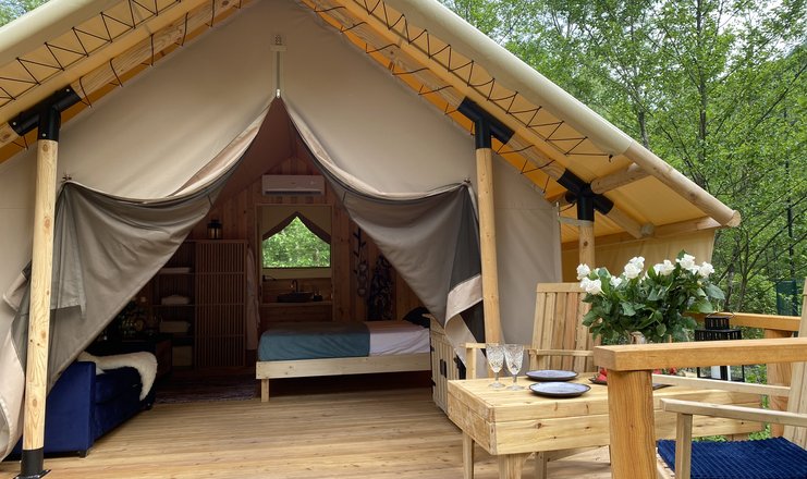 Очень релаксирующее место. Домики уютные (скорее палатки), внутри есть и камины, и кондиционеры, душевые, тапочки, халаты, кофемашины! И даже умные унитазы. Живешь в шалаше, но с комфортом номера люкс. Хороший вай-фай. Spa великолепный: влажная соляная сауна, финская сауна, баня русская и баня русская, которая топиться по-чёрному, бассейн и джакузи, раздевалки с душем и шкафчиками. Кругом лес, под ногами зайцы, сверху птицы. Где-то рядом журчит горная река. Ресторан вообще песня, так вкусно давно не ела, авторское меню, завтраки-все б так жили. И очень приветливые люди. Доехали из Сочи на BelkaCar. Очень рекомендую.