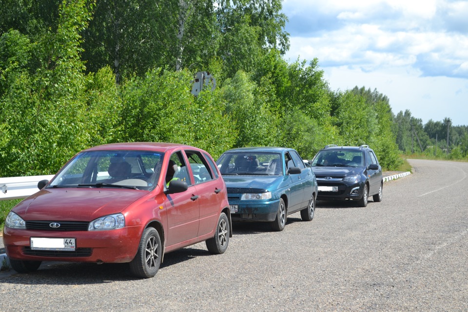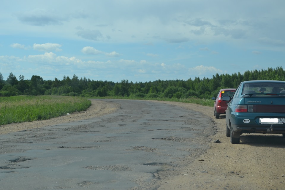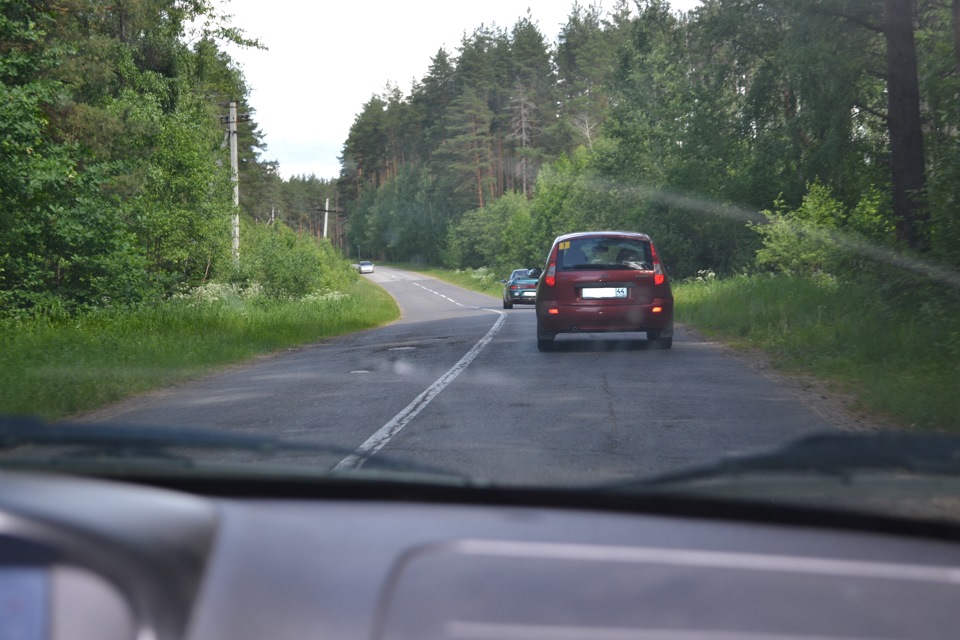 По дороге на Кострому я встаю первым в колонне. Дорогу я эту знаю, много по ней ездил, да и другу его машину покупали там, так же как машину моей девушки (чёрная тонированная калина хэтчбэк 2010 года), да и мою тоже там покупали. Примерно минут за 40 доезжаем до Костромы. Навигатор предлагает до Спаса 2 дороги. Выбираем ту, которая короче. Костромская область "славится" своими дорогами, собственно вот такой пример короткой дороги до Спаса. Благо чуть позже она всё же стала более приемлемой…но не на долго)