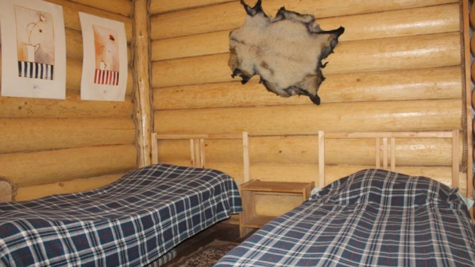 — 2 большими двуспальными кроватями, раскладным диваном из массива сосны (дополнительные места), над ними — 2 односпальные кровати;