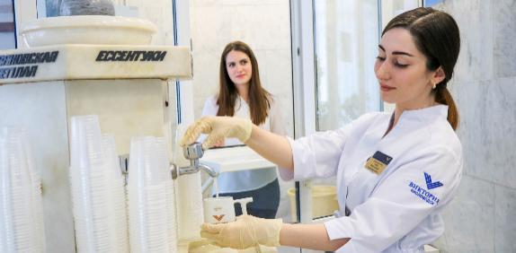 - В холле санатория находится собственный бювет с минеральной воды «Славяновская» и «Ессентуки-4», а рядом с санаторием находится знаменитый Желябовский бювет с сульфатным нарзаном. Каждая минеральная вода по-своему уникальна и благотворно сказывается на лечении. Такого ассортимента минеральных вод не встретишь в другом санатории Кисловодска.