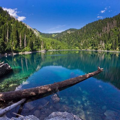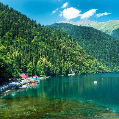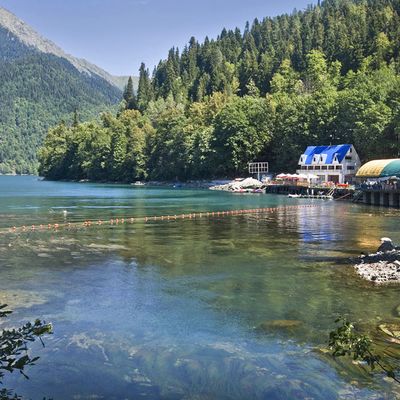 Не были на Рице — не были в Абхазии, и это не шутка. Вы поймете, почему есть такое выражение, когда увидите его своими глазами. Озеро Рица — визитная карточка Абхазии. Рица во многих отношениях лидер: это самое известное, самое большое и одно из самых красивых озер Абхазии. Оно расположено на высоте около 950 метров и с трех сторон окружено горами. Вода в Рице такая прозрачная, что сквозь ее толщу можно разглядеть стремительную форель, сигов, голавлей и микроскопические водоросли.