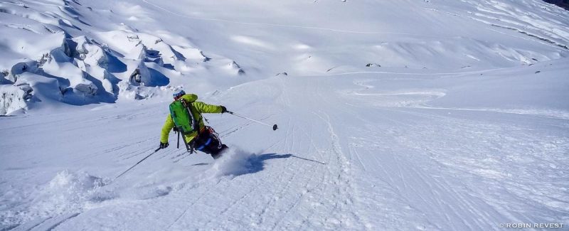 Как только облако над нами осталось позади, видимость стала получше, мы шли за Франсуа, прокладывая путь по скалистому траверсу и вскоре очутились на вершине Couloir Patou. Нас ждала неплохая разминка. Первые несколько метров склон был очень узкий, но потом расширялся и снег здесь был немного глубже, кататься было приятно. На склоне кроме нас никого больше не было. К счастью, группа подобралась хорошая, и после этого спуска все мои дурные предчувствия улетучились. Поездка обещала быть очень даже ничего!
