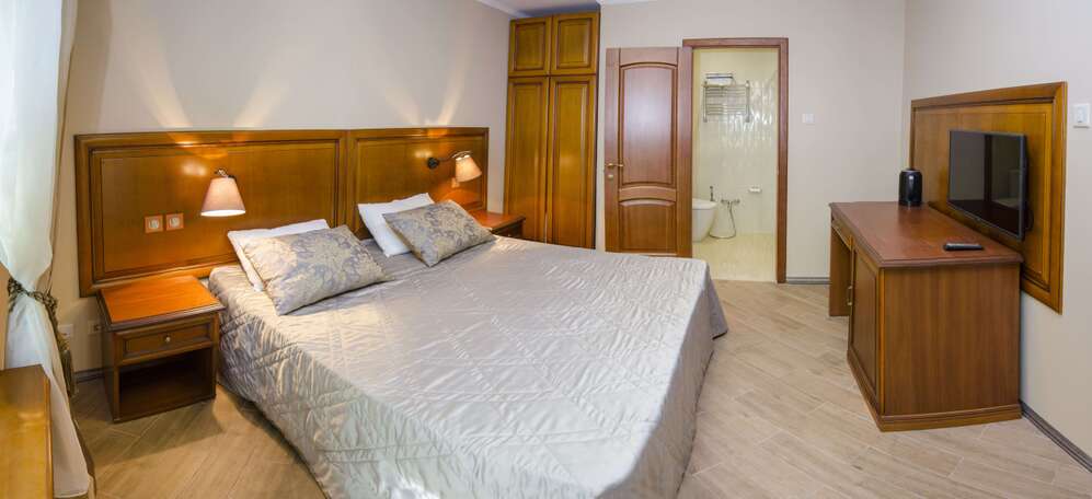 Туалет в номере, Полотенца включены, Смена постельного белья, Холодильник, Сплит-система, Душ в номере, Сейф в номере, Телевизор, Фен, Утюг, гладильные принадлежности, Диван, Кондиционер, Шкаф, Стулья, Умывальник, Двуспальные кровати, Балкон, Отопление, Ежедневная уборка в номереЖилой фонд, рассчитанный на 40 человек, предлагает отдыхающим двухместные номера Стандарт и четырехместные Семейные номера, оснащенные всем необходимым. В каждой комнате есть собственный санузел с душевой кабиной, сплит-система, телевизор, беспроводной интернет. В семейных номерах предусмотрена мини-кухня.