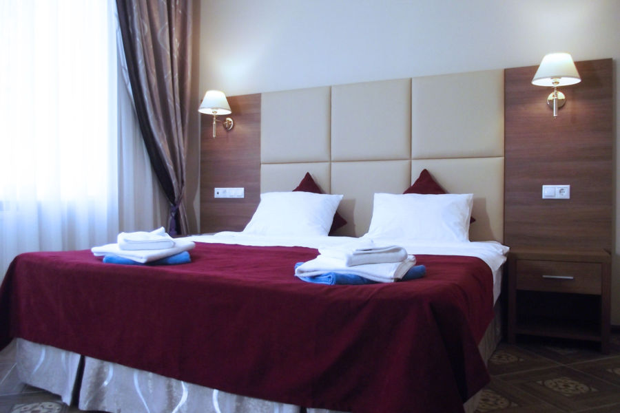 Просторный, комфортабельный и светлый номер категории Стандарт с одной большой двуспальной кроватью (160*200 см) или с двумя односпальными кроватями (80*200 см) (по желанию) прекрасно подойдет для людей ценящих уют, функциональность и практичность каждой детали интерьера. Санузел с душевой кабиной, раковиной и унитазом в каждом номере.