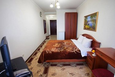 - номер люкс повышенной комфортности с балконом - оснащен мягкой кожаной мебелью, душевой кабиной, телевизором, телефоном с внутренней связью и выходом в город, системой кондиционирования, холодильником и балконом в 20 кв.м