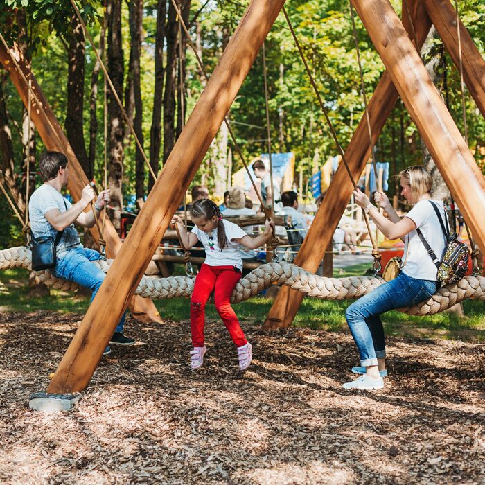 Чтобы никому не было скучно, хорошо продуманы все виды развлечений: прогулки на деревьях по канатным переходам, аркадные игры, перекати поле, множество игровых площадок, теннисный корт и футбольное поле. Для любителей фауны можно понаблюдать и покормить различных животных на ферме, таких как: альпака, белки, сурки и зайцы, овечки, козочки и другие.