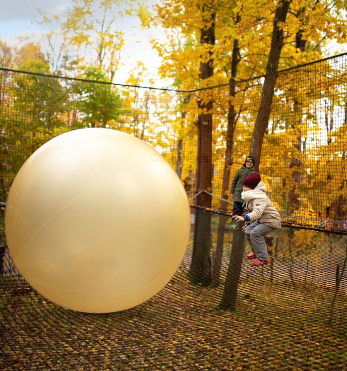 Знакомые и любимые всеми с детства сеточные батуты натянуты прямо между деревьями! Здесь можно весело скакать и прыгать, перекатывая огромные надувные мячи.