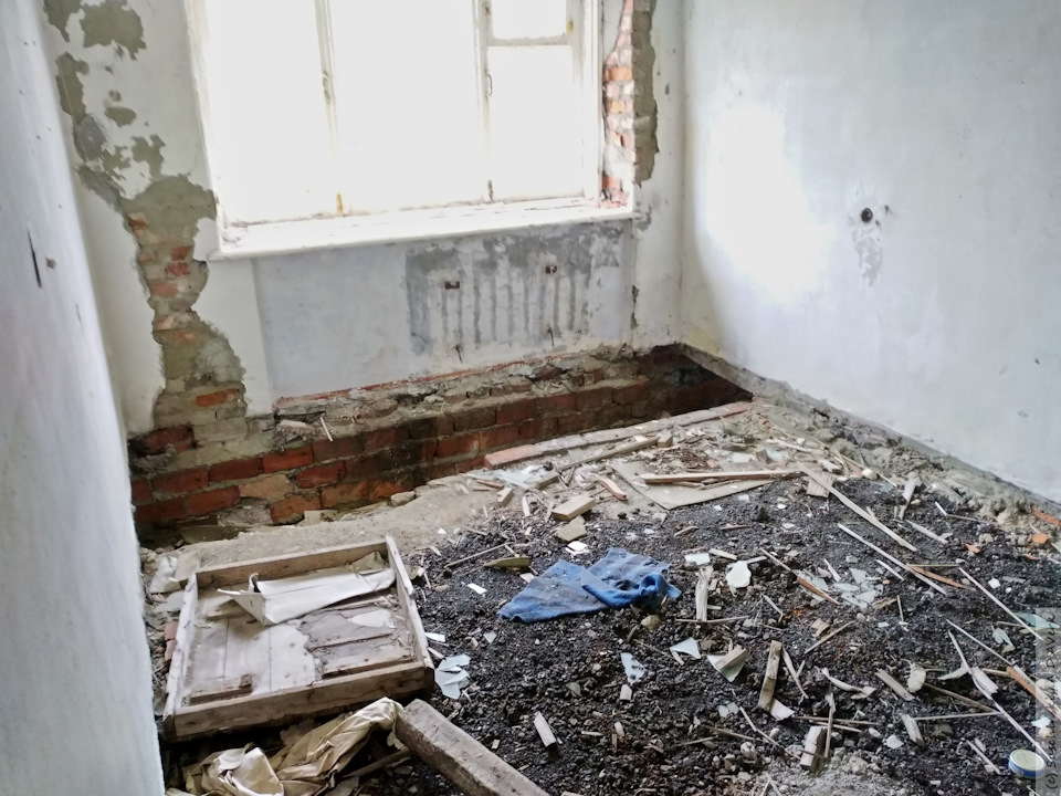 Вскрыт и отсутствует деревянный пол, видно как выламывали полы, чтобы вытащить трубы, потащена вся сантехника.