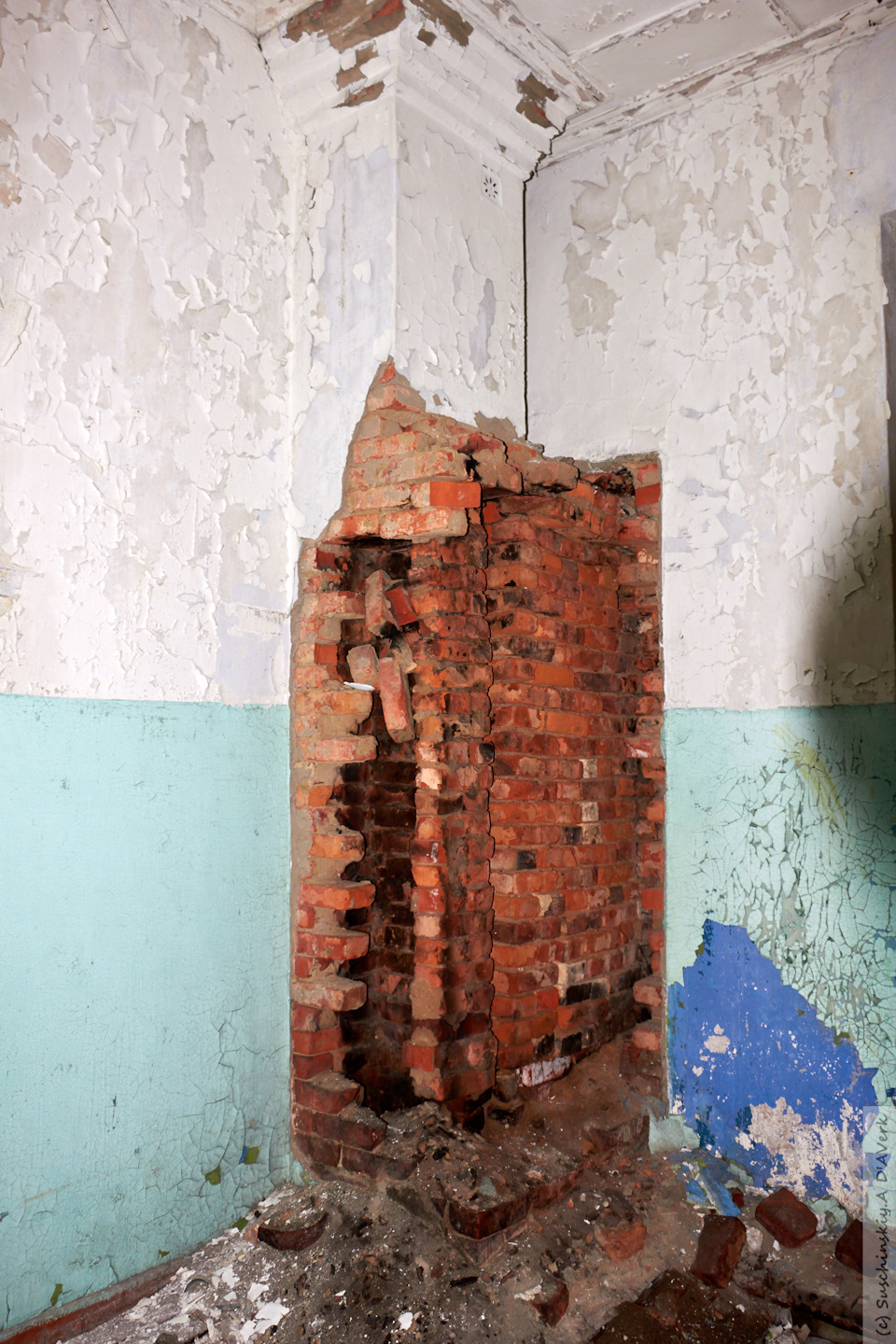 в самой школе печки по углам комнат, зачем-то тоже раздербаненные (выламывали металлические дверцы?).
