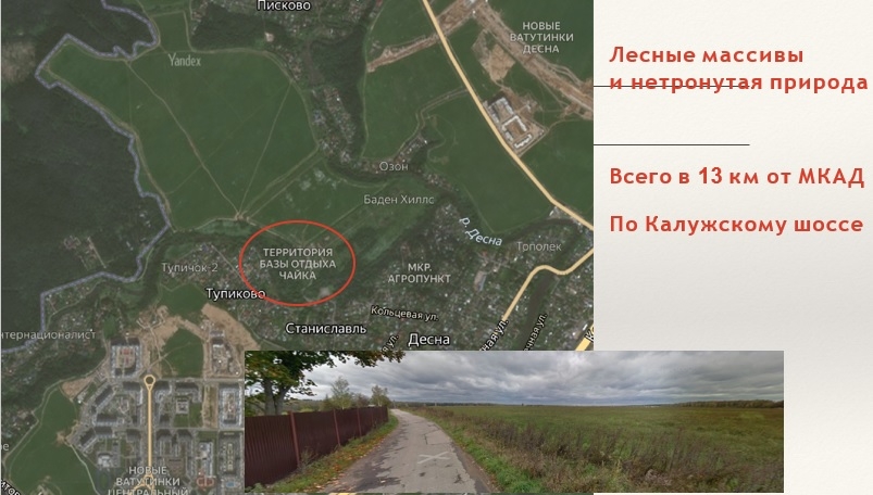 10 километрах от московской кольцевой дороги в направлениях с самой низкой загруженностью Подмосковья вдоль по Калужскому и Киевскому шоссе.