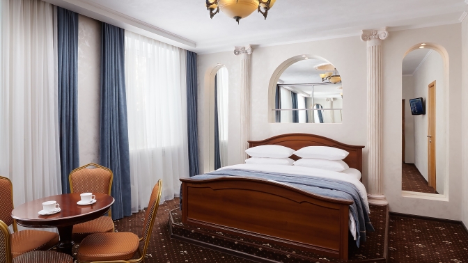 Площадь номера категории люкс составляет 35 кв. м. Двухкомнатный номер в тематическом стиле понравится всем ценителям элитарного отдыха. Здесь есть джакузи, телевизор, холодильник, предусмотрена рабочая зона. Из окон открывается вид на лес. В семейном номере есть гостиный уголок и все удобства. Площадь апартаментов составляет от 40 до 60 кв. м. Отличительная особенность — наличие кухонной зоны. От всех номеров отличаются двухуровневые апартаменты. Это трехкомнатный дуплекс площадью 68 кв. м.
