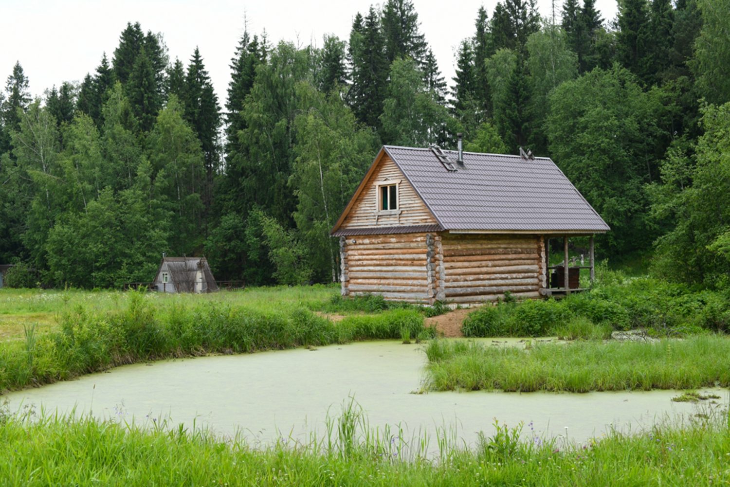 Банный комплекс, на берегу старого русла реки Талица, представляет собой двухэтажный сруб.