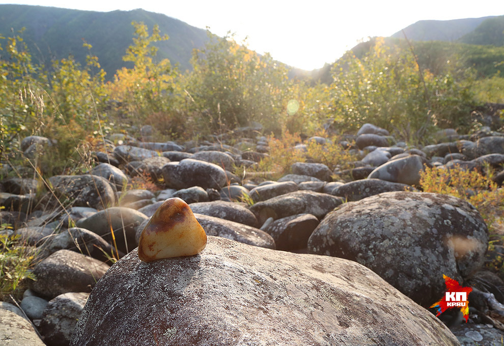 Воду для еды и чая с Витима мы не брали, вполне вероятно, что в этом месте повышенная радиация. Весь берег и дно возле нашего лагеря покрыт каким-то черным камнем. Вода в больших бутылках за ночь замерзла, поэтому мы разрезали бутыли, раздробили лед, сложили лед в чайник и так вскипятили себе чай.