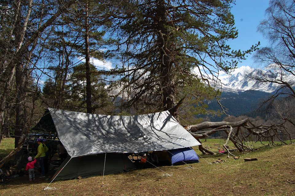 Тент тоже штука нужная в походе. Это кусок водостойкого и ветронепроницаемого материала, который обычно натягивается над местом, где все собираются вместе (например, над костром), чтобы, если пойдет дождь, не разбредаться по своим палаткам, а романтично сидеть вместе и петь песни под гитару. Если нет специального тента, подойдет любой кусок брезента, желательно не менее 3*3 метра, который натягивается между близстоящими деревьями.