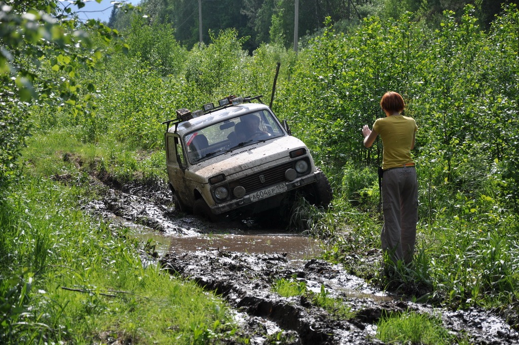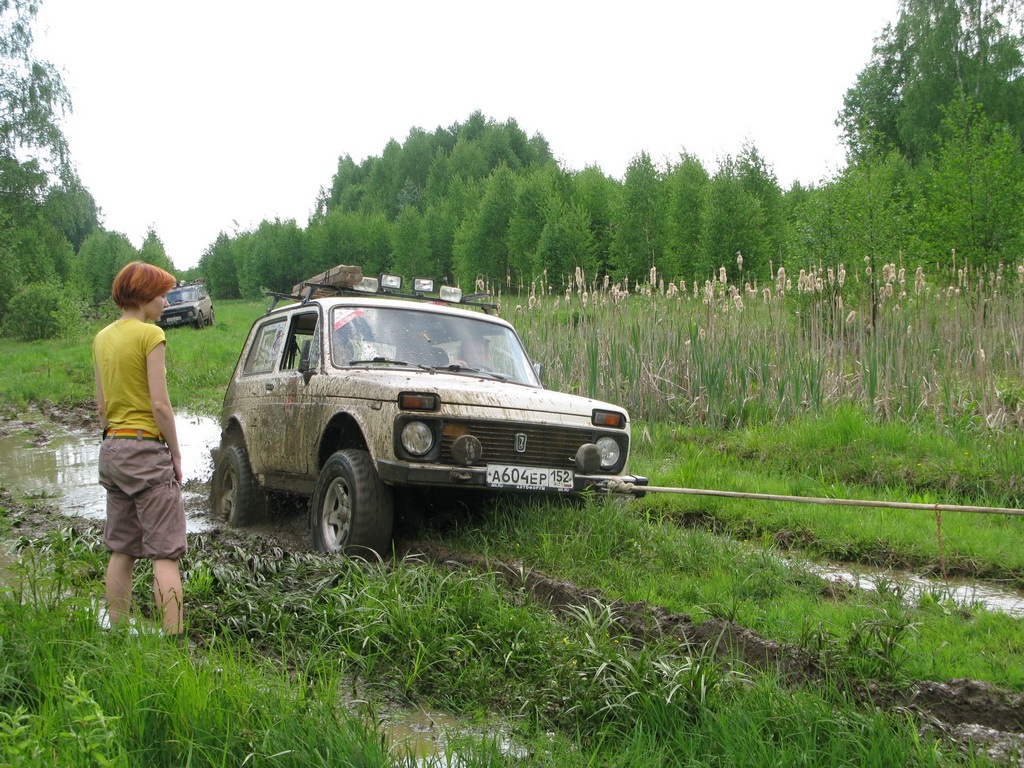 На заболоченном луге на меня опять накатывает и я решаю пройти засаду другой траекторией — сваливаюсь одной стороной в колею, заполненную водой, глубиной примерно по колено штурману. И вот опять вместо того, чтобы вернуться и проехать «как надо» цепляюсь на трос и протаскиваюсь дальше. Спасибо вам, тоскатели. В очередной раз получаю от штурмана…