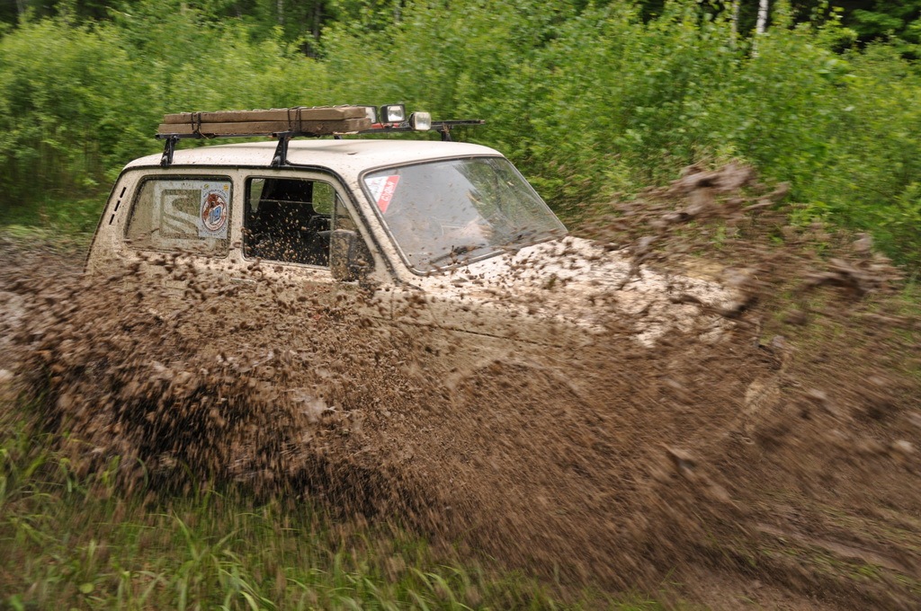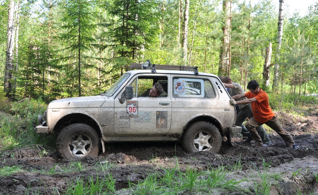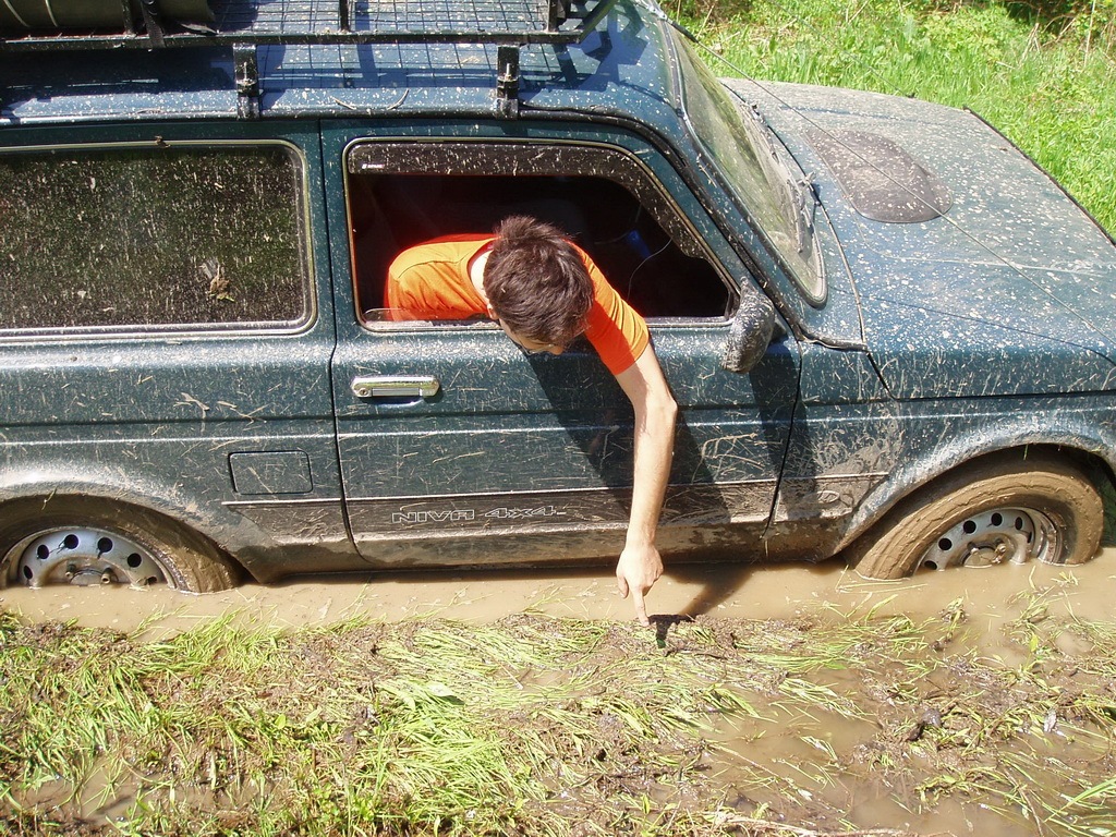 После того, как Дёма был радостно извлечён из грязьки, мы со штурманом рисуем правильную траекторию. Включаю передачу, добавляю газ, отпускаю сцепление…и вижу/понимаю, что не попадаю в траекторию, но вместо того, чтоб сдать назад и правильно зайти на курс — добавляю газ и разбрызгивая грязь сажусь на брюхо. почему так иногда происходит, я и сам не могу сказать. Конечно я огребаю от штурмана и поделом мне.