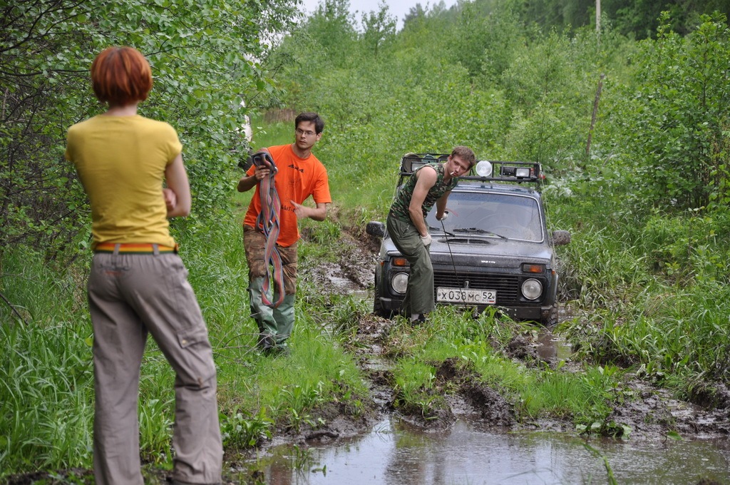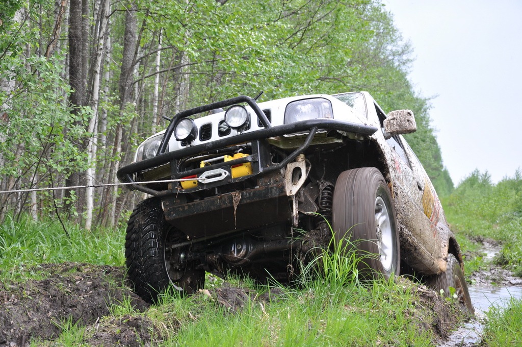 Следом немного размешанная лужа — Джимка на слегка стравленных колёсах проезжает за счёт просвета и хорошего настроения, Дёмина нифка подвисает на брюхе. Разматываем его о-о-о-очень длинный рывковый трос и медленно и плавно Йорик вытягивает аппарат.