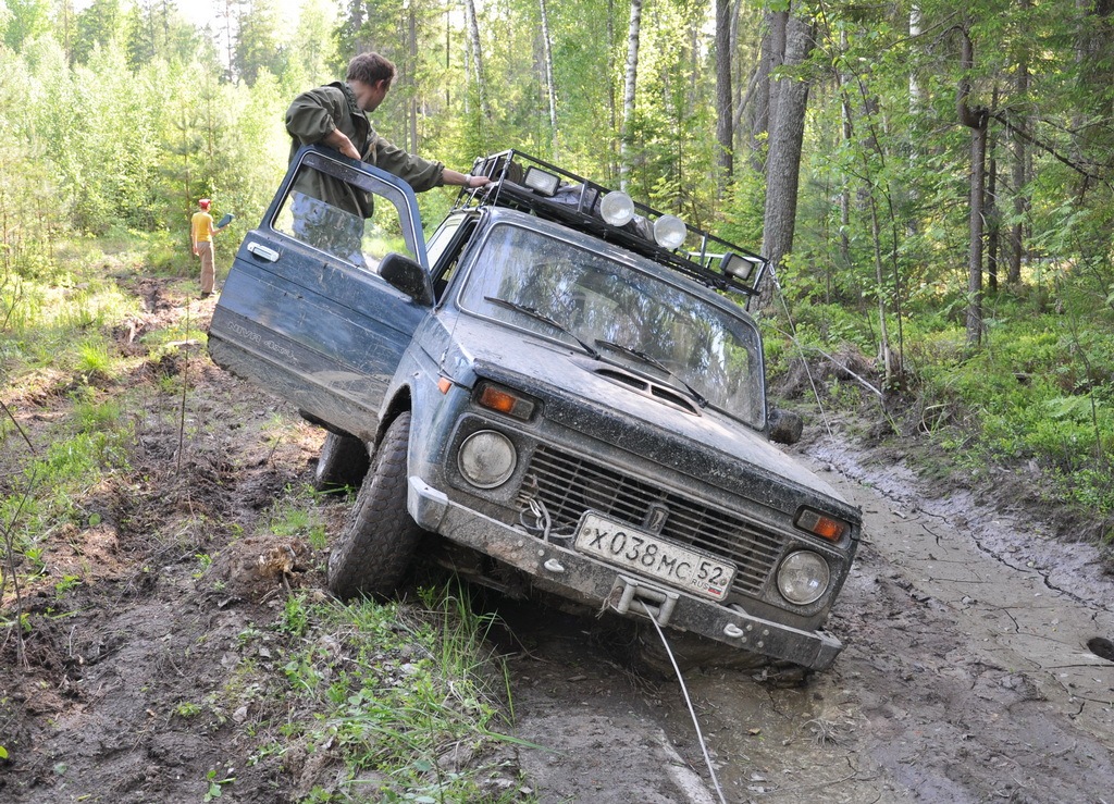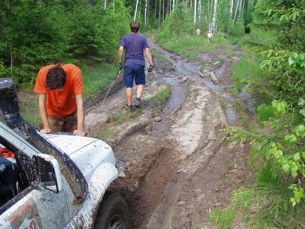 Дёма решает повторить его тактику, но свою засаду находит гораздо раньше ввиду меньшего просвета и отсутствия межколёсной блокировки. Винчуемся и лебедимся с перестёжкой. И вот на пути встаёт та засада в которой сидел Йорик — Дёма ныряет — разматываем лебёдку. Немного подтягиваем и тут лебёдка говорит ”хрен-вам” «вжик» и перестаёт работать. Попрыгав вокруг лебеды разворачиваем Йорика и вытягиваем им Дёму. Ситуация иллюстрирует слова широко известного в узких кругах автора: «На трофимобиле лебёдка либо есть, либо нет, либо есть, но сгорела»(с)