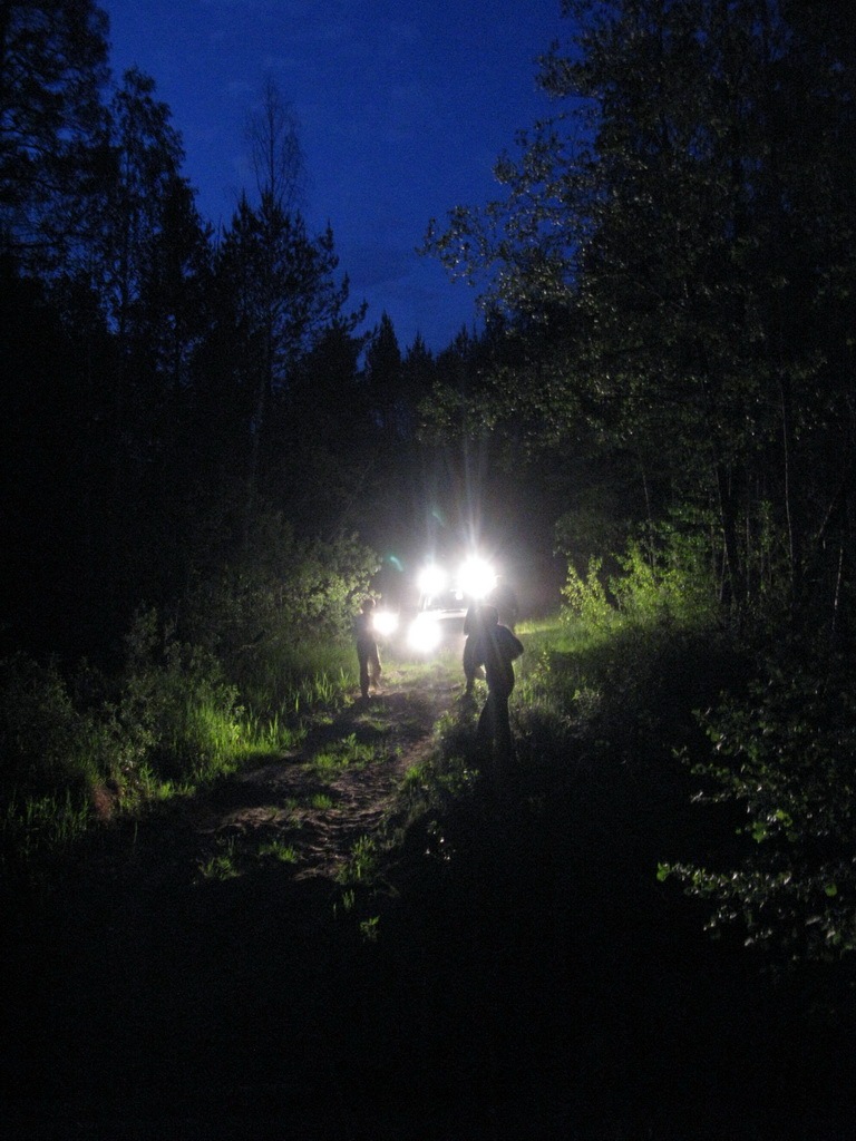 Вот и в нашем случае — для того, чтобы штурман нашего идейного предводителя : ) смогла поехать с нами в субботу ей пришлось задерживаться в городе в пятницу. А присоединятся они к нам уже утром, после нашей ночной стоянки. Обещали явиться к нам на лесной завтрак. А мы тем временем двумя экипажами держим путь в сторону предполагаемого места стоянки. Эдакий ночной этап под названием «доездинг-до-лагеринг»(с). Бездорожья практически никакого, зато весёлый песочек, лесные дорожки и местами элементы операции «буря в пустыне» — пылища, проще говоря.