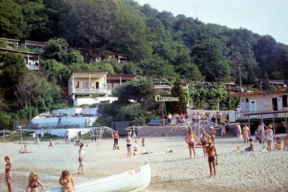 Пляж у базы отдыха МГУ, 1981 г. От рыбзавода вдоль пицундского побережья ходили всегда, сколько помню эти места. Бывало, сидишь на песчаном пляже Второго ущелья (раньше отдыхающих там было столько, что после позднего завтрака места уже были в дефиците), так вот сидишь в тесноте, в карты с друзьями, к примеру, играешь, а через тебя проходит плотный трафик ходоков - кто по одиночке, кто парочкой, а нередко целой компанией.