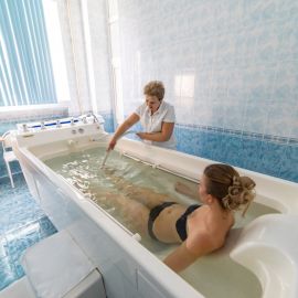 - бальнеолечение — естественные минеральные ванны (нарзан), хвойные, жемчужные, йодо-бромные, вихревые ванны; лечебные души (циркулярный, веерный, восходящий, Шарко); подводный душ-массаж; десневые орошения нарзаном; орошение лица минеральной водой; ингаляции минеральной водой;