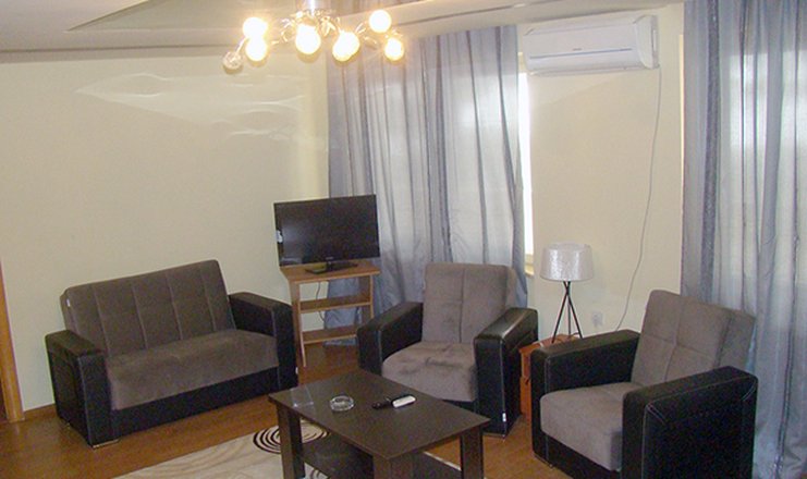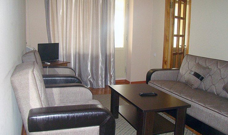 - 3 номера категории «Апартаменты» – двухкомнатный номер с просторной террасой с видом на море. В одной комнате спальня с большой двуспальной кроватью и комодом, в другой – гостиная с мягкой мебелью, журнальным столиком, телевизором. В номере индивидуальная система кондиционирования, есть Wi-Fi.