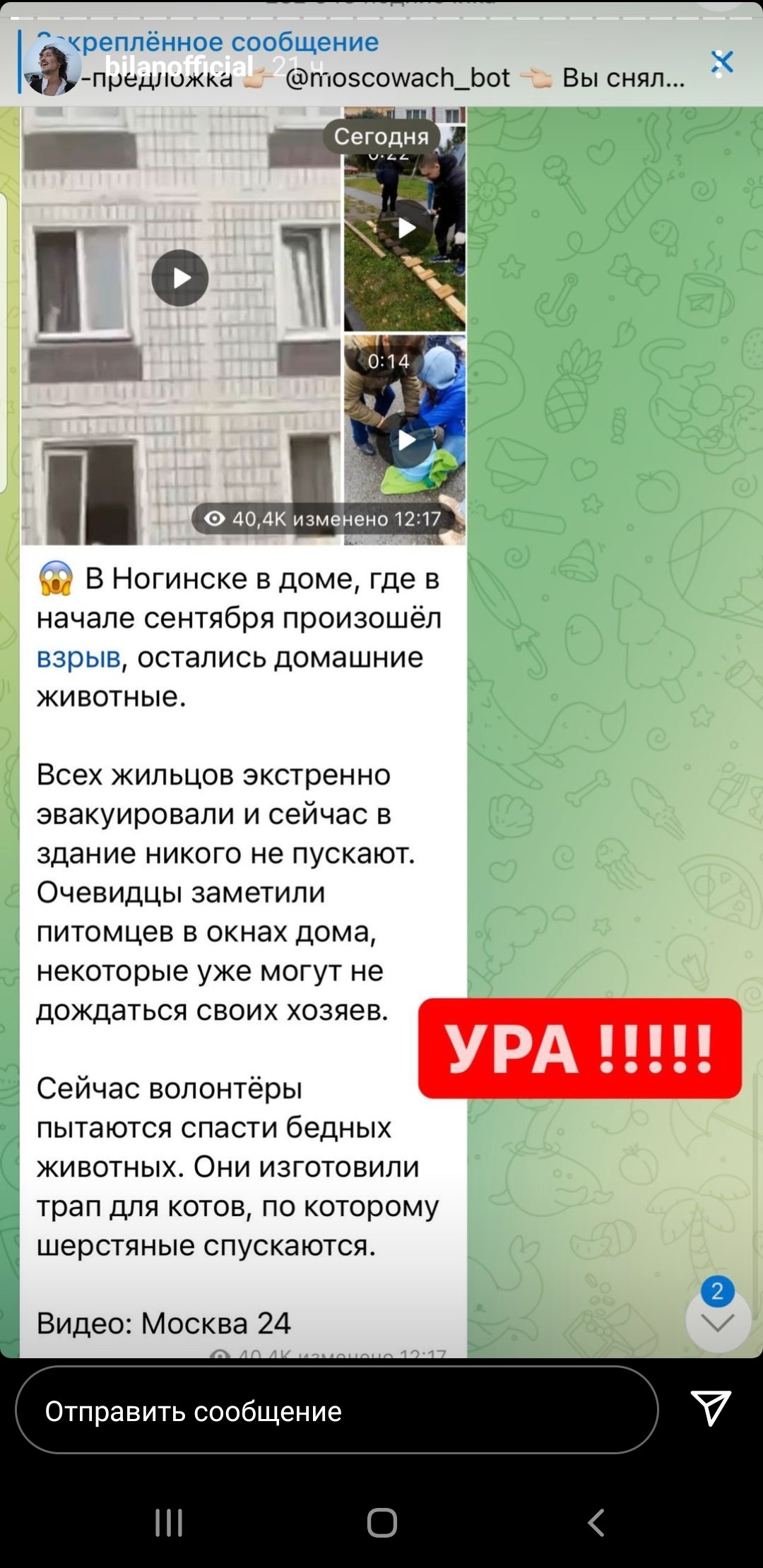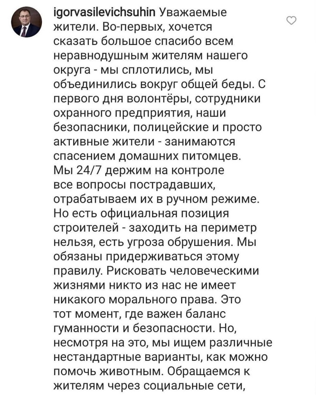 - Мы 24 на 7 держим на контроле все вопросы пострадавших, отрабатываем их в ручном режиме. Но есть официальная позиция строителей – заходить на периметр нельзя, есть угроза обрушения. Рисковать человеческими жизнями никто не имеет права. Это тот момент, где важен баланс гуманности и безопасности. Но несмотря на это, мы ищем различные нестандартные варианты, как можно помочь животным, - ответил на многочисленные комментарии в соцсетях Игорь Сухин, глава Богородского районного округа.