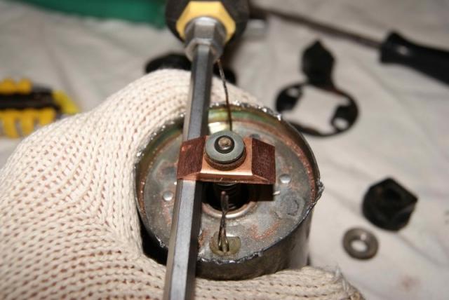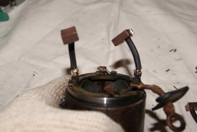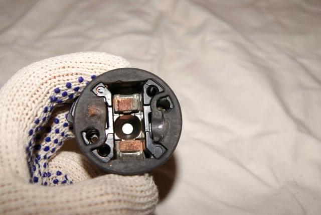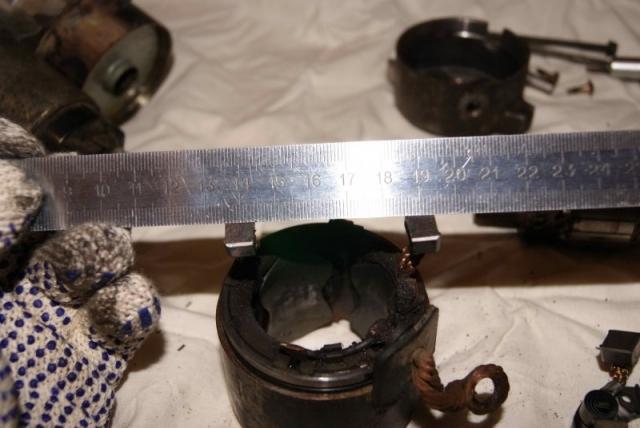 Далее делаем то, из-за чего и затеяли разборку, т.е. меняем щетки. За ранее были прикуплены в магазине щетки, не оргининалы японского производства (оригиналов не было), подобраны по посадочным отвертиям в щеткодержателе. подошли полностью, кроме длины, необходимо было чуток укоротить на 1,5-2 мм, что сделано тем же напильником без проблем. Номинальная высота щеток по мануалу 14 мм, если больше то уже не влезут под пружинку.