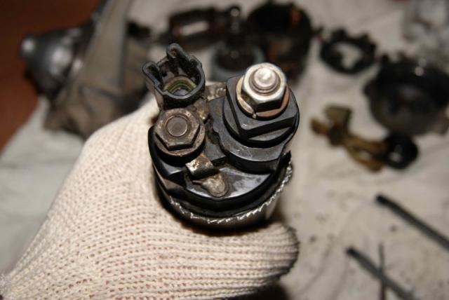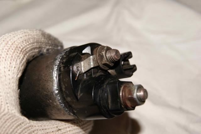 Решил не останавливаться на достигнутом и провести ревизию остальных частей стартера. Открутил 2 гайки крепящие тяговое реле к корпусу, и снял реле.