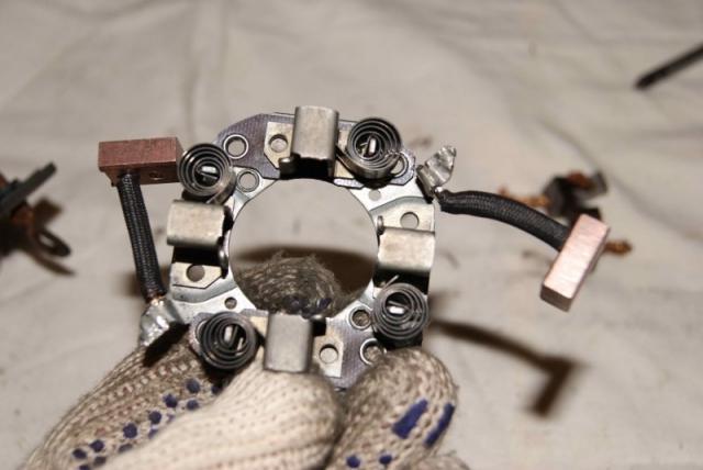 На щеткодержателе разгибаем усы, которыми зажаты провода щеток, отрываем щетки, на эти места впаиваем новые и зажимаем обратно