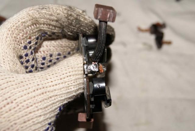Теперь возьмём кусачки и щётки отщелкнем от стартера, они были хорошенько приварены, по-этому оторвать их просто невозможно. Далее с помощью паяльника мы припаяли новенькие.