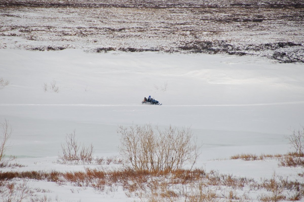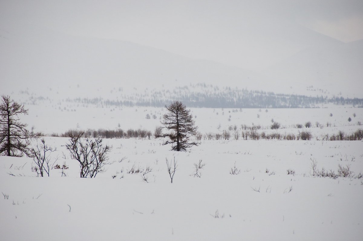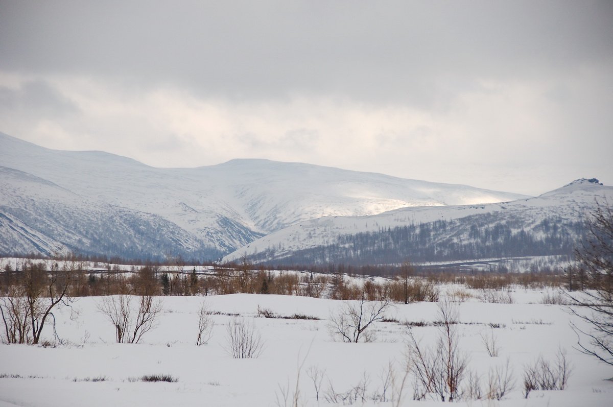 Переехав первые хребты, картина поменялась. Тундра ещё снежная, но уже идеально ровная.