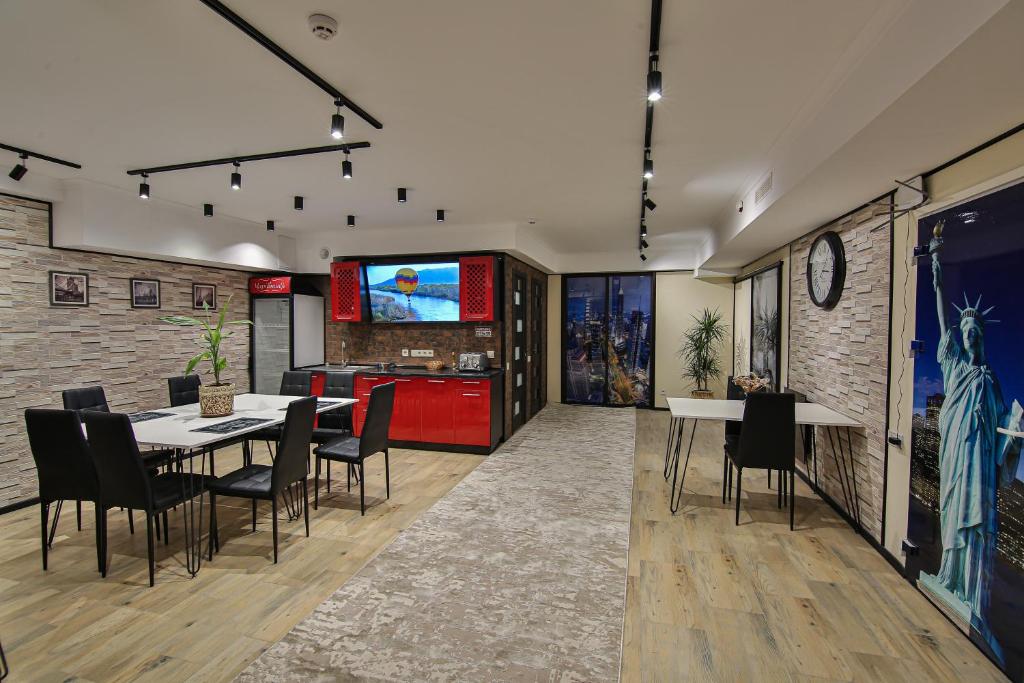 Затишні номери на 2-, 3-, 4-х осіб із усіма зручностями. Просторі кімнати з окремим входом, передпокоєм, кухнею, м'яким куточком, телевізором, кондиціонером, холодильником, санвузлом з душем, туалетом, умивальником і біде.