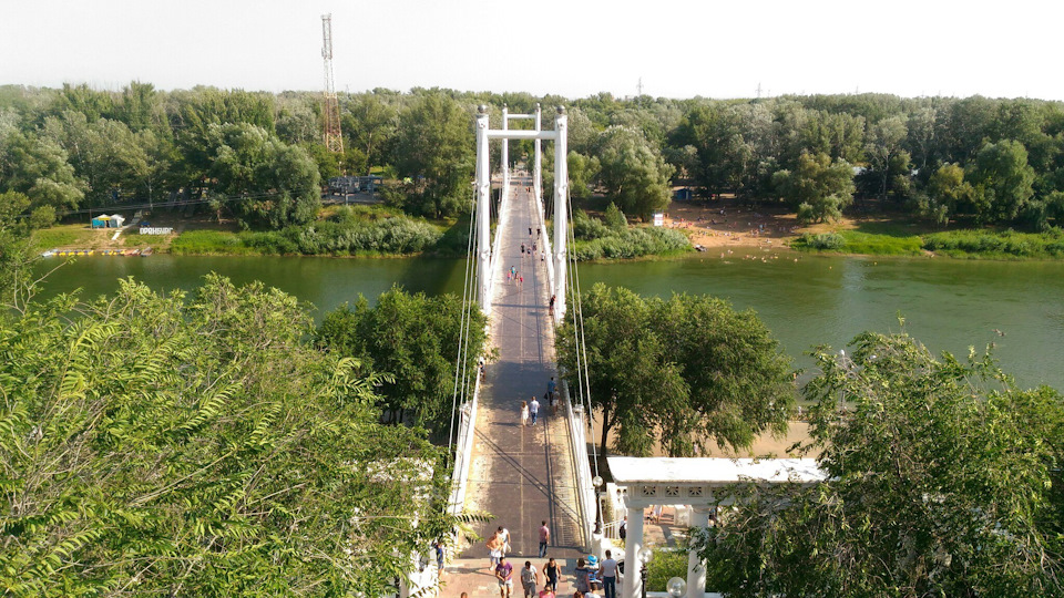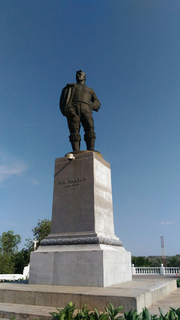 За час доехали до Оренбурга и припарковались около пешеходной улицы Советская. Сначала пошли в сторону моста через реку Урал, разделяющего Европу и Азию. Самое интересное, что мост располагается с Севера на Юг, поэтому ну никак не может разделять Европу и Азию. Окончание улицы Советской венчает огромный памятник Чкалову, в честь которого в Советское время был назван город, только сам Чкалов никогда сам в городе не бывал.