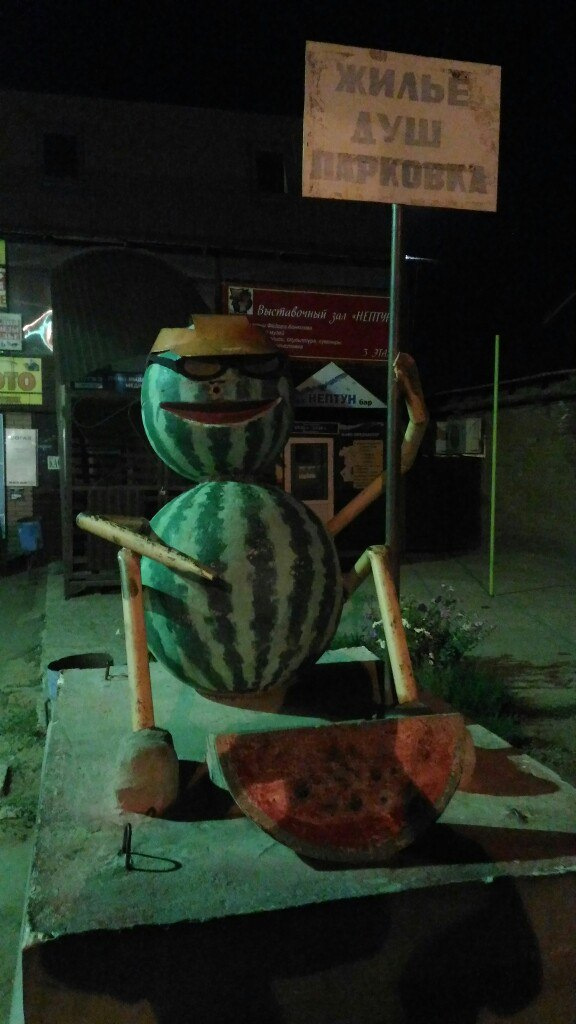 И снова степь, узкая, но хорошая дорога. Слева меж чахлого кустарника заметили бахчу, раньше я наблюдал ее только из окна автобуса. Необходимо посмотреть ей в лицо. Прошел через заросли, увидел большое поле, а на нем дыни, не удержался, взял одну без спроса. За километр до Соль-Илецка увидели вереницу встречающих, предлагают жилье. Выбрали двух понравившихся нам тетенек, остановились. Предложили дом за четыре тысячи на четыре дня, сторговались за 3,5. Дом большой, три спальни и гостиная, удобства во дворе. Времени было 15:00 местного, заселившись, сразу спросили дорогу на озеро.